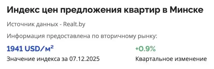 Средняя стоимость квадрата в столице приближается к $2000. По статистике Realt, средняя цена метра на вторичном рынке Минска в начале декабря составляет $1941. Примечательно, что это не пиковые цены 2025 года, так как в последнее время наблюдается небольшое снижение. Например, в октябре в Минске просили по $1980 за метр.