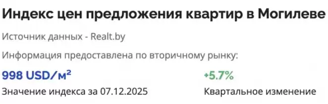На начало декабря 2025 года квадрат в Могилеве в среднем оценивают в $998. В прошлом году за квадрат в Могилеве в среднем просили по $840. Годовой прирост составил более 18%.