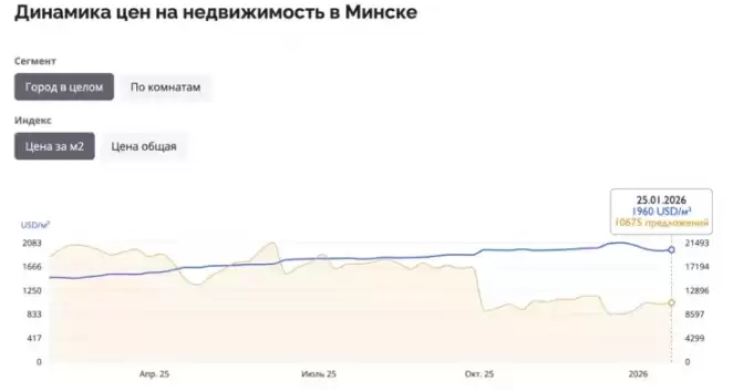 Согласно статистике Realt.by, пиковые цены наблюдались 28 декабря 2025 года, когда средняя стоимость метра в столице по предложениям выросла до 2083 долларов.