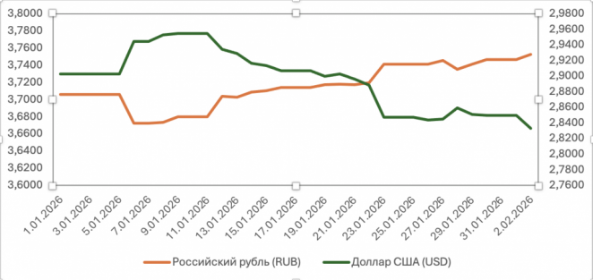 В прошедшем месяце наблюдалось кратковременное укрепление доллара США к беларусскому рублю при одновременном снижении российского. Такая динамика была вызвана периодом новогодних каникул в России. Однако, как только валютный рынок России восстановил полноценную работу, тенденция 2025 года продолжилась.