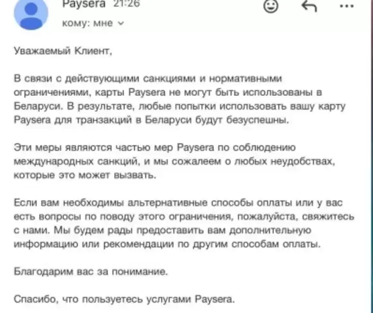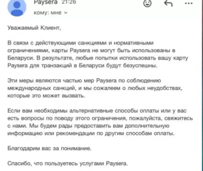 Белорусские пользователи карт Paysera получили письма от банка о том, что транзакции по ним в нашей стране «будут безуспешны».