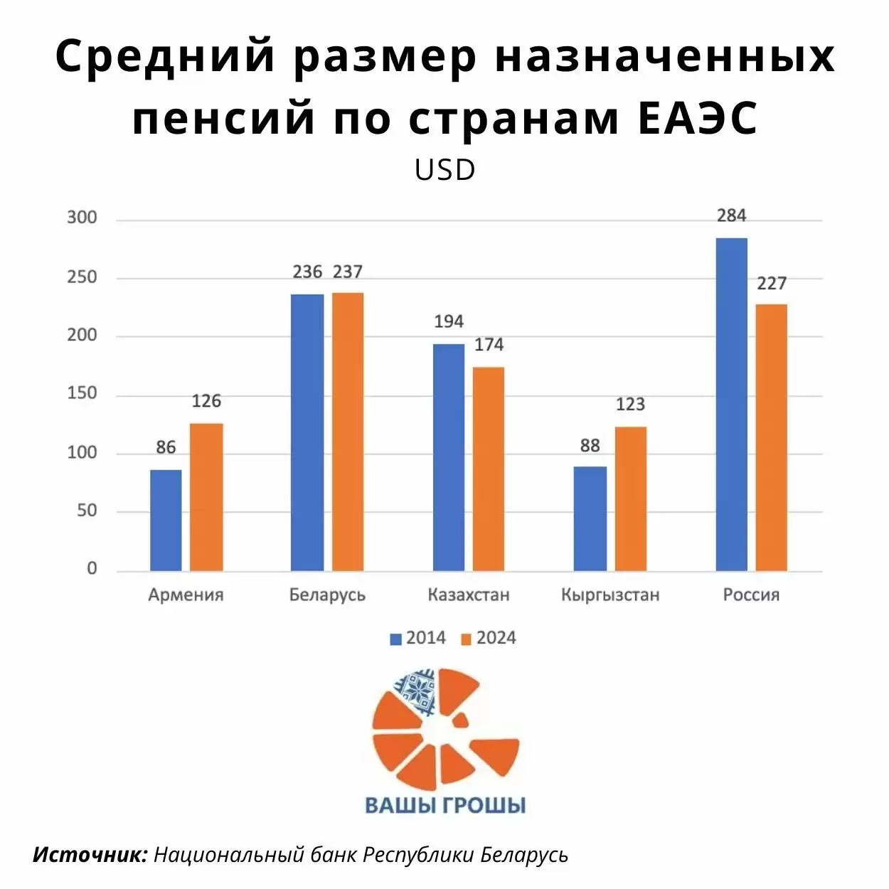 По этим данным в 2024 году средняя пенсия в Беларуси составила $237 в месяц, в России — $227. Дальше идут Казахстан ($174), Армения ($126) и Кыргызстан ($123).