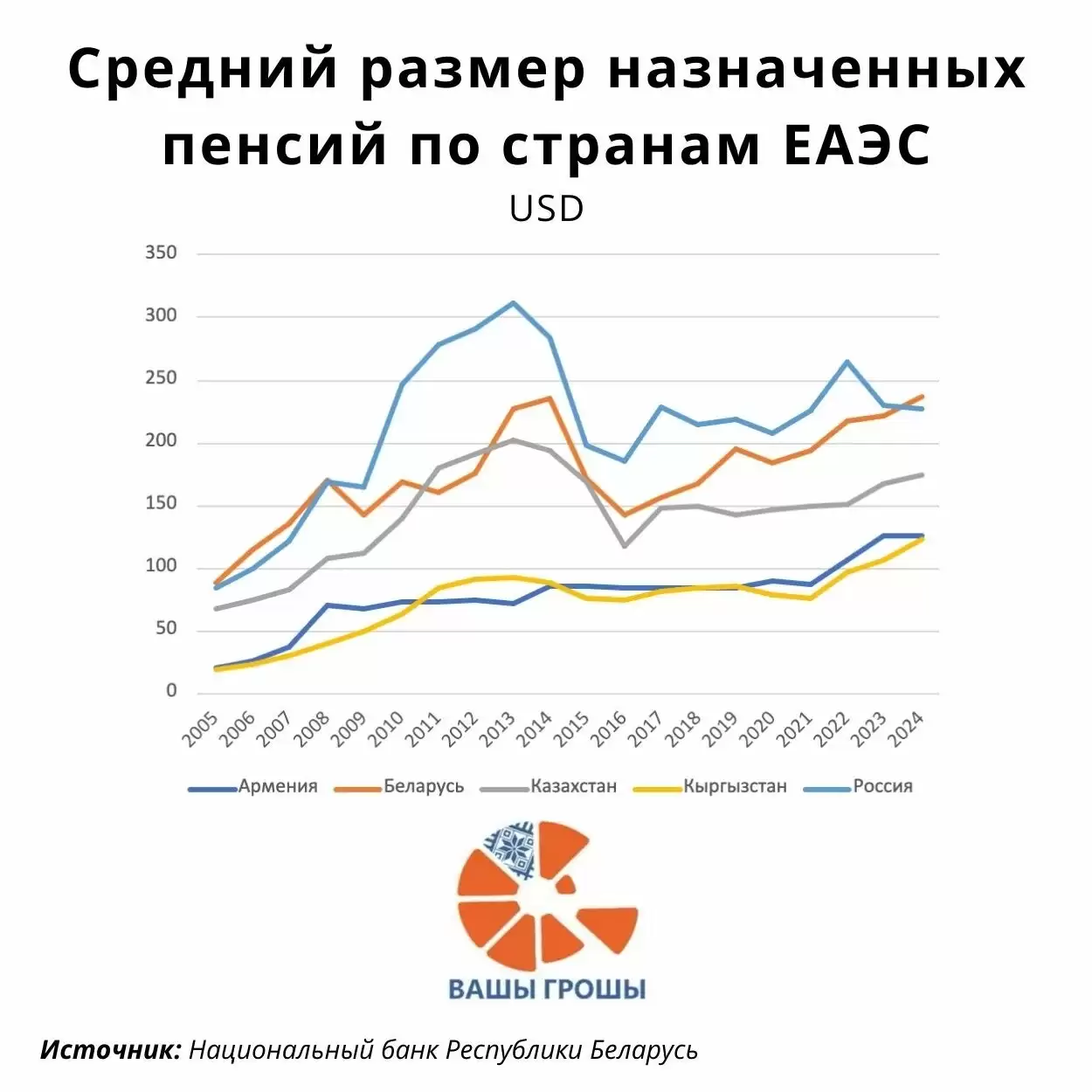 На этом месте обычно и делают многозначительную паузу: «Беларусь — первая в ЕАЭС». Формально да. Но это — лидерство внутри бедной лиги, и это хорошо видно, если расширить рамку до 10 лет. В 2014 году пенсия в Беларуси была на уровне $236 в месяц (среднее за год), а в 2024-м — $237. Плюс один доллар за десятилетие — почти нулевая динамика.