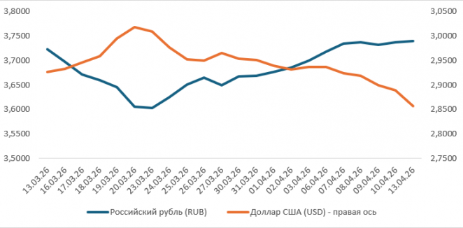 С 6 по 13 апреля 2026 года стоимость корзины валют снизилась к рублю на 0,68%, что вернуло ее к значениям начала марта – Br 0,175. Доллар США девальвировал к белорусской валюте на целых 2,71% до Br 2,8569 за $ 1. Евро также подешевел (– 1,31%) и стоил Br 3,3449. Российский рубль продолжил укрепление (+0,59%) и достиг Br 3,74 за 100 рос. рублей. Китайский юань ослаб на 2,2% и 10 китайских юаней стоили Br 4,2122.