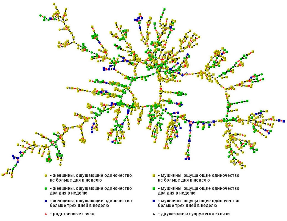 Схема социальных контактов людей в городе Фрамингем и их оценка собственного одиночества. На рисунке видно, что синие узлы (люди, испытывающие чувство одиночества) имеют тенденцию группироваться. Иными словами, наиболее одинокие жители в основном связаны социальными отношениями с себе подобными