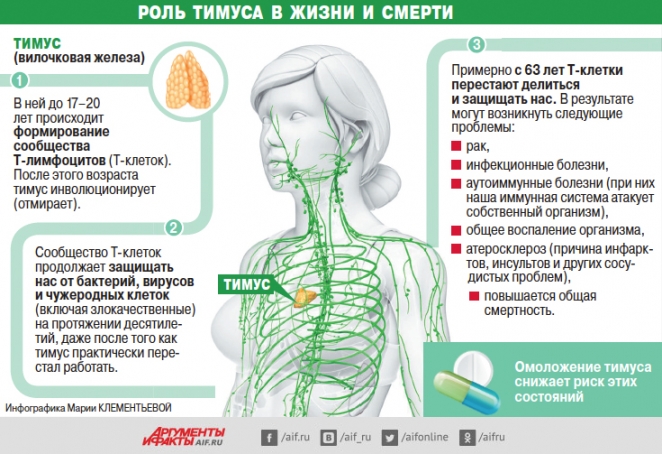 Кроме того, у многих участников эксперимента произошло омоложение тимуса. Это маленькая железа, расположенная за грудиной, в которой созревают так называемые Т-лимфоциты (буква «Т» в их названии говорит о том, что они связаны с тимусом). Благодаря им иммунитет распознаёт врагов (бактерии, вирусы, чужие клетки и т. д.) и уничтожает их. Это защищает нас от многих болезней (см. инфографику). Дело в том, что после 20 лет тимус претерпевает обратное развитие и перестаёт работать. То есть все Т-лимфоциты организма формируются ещё в молодости. Они запрограммированы на определённое количество делений. И после 60–70 лет они не могут делиться и оказывать отпор чужеродным клеткам. В результате пожилые люди часто умирают от обычных инфекций и рака. Об этом «Аргументам и фактам» недавно рассказывал известный генетик, академик РАН и ректор РНИМУ им. Пирогова Сергей Лукьянов. У него в университете изучают эту проблему. И возрождение тимуса, достигнутое в эксперименте, — важный фактор омоложения.
