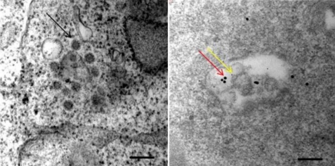 Слева - клетка почки, зараженная коронавирусом. Черная стрелка указывает на вирусную частицу внутри клетки. Справа - колокализация вирусного белка SP (красная стрелка) и CD147 (желтая стрелка)