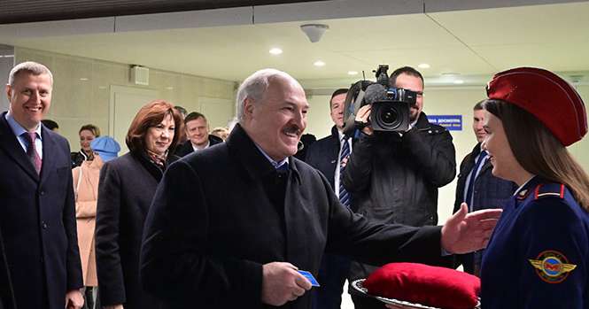 Как только Лукашенко подъехал к новой станции метро, к нему подошли девушки в форме и люди с телекамерами.