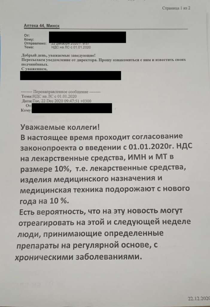 В редакцию Blizko.by попало интересное письмо, которое разослали в одну из сетей аптек. В нем сказано, что с Нового года власти планируют ввести НДС в размере 10% на лекарственные средства, изделия медицинского назначения и медтехнику. Это скажется на итоговой стоимости этих позиций для конечного потребителя.