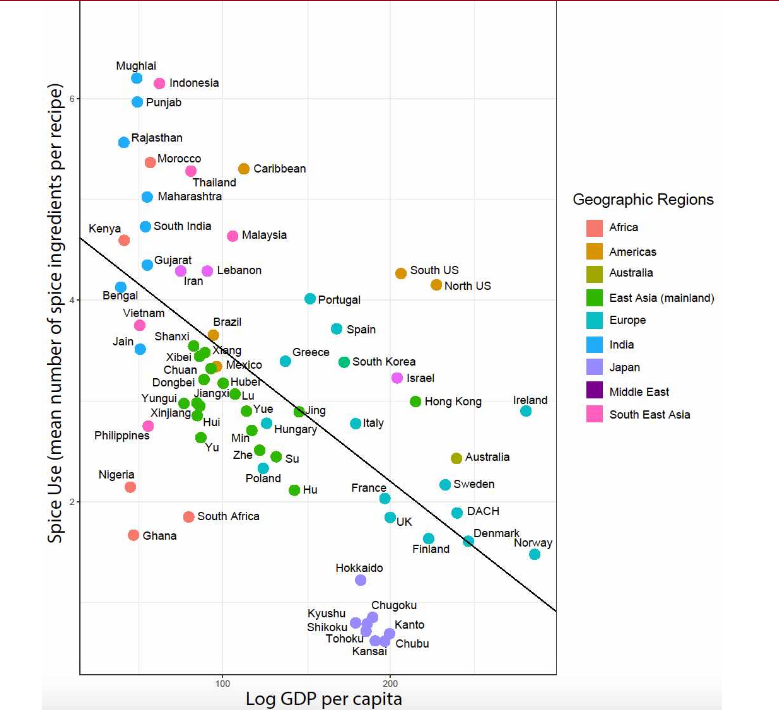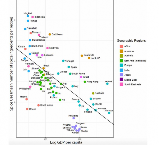На фото: обратная зависимость между количеством специй в традиционных рецептах национальных кухонь и ВВП на душу населения