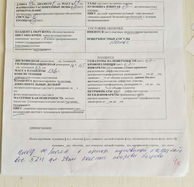 Однако самой Марии удалось найти бланк макроскопического описания последа, в котором от руки написано, что малышка при рождении весила 524 грамма и была 29 сантиметров.