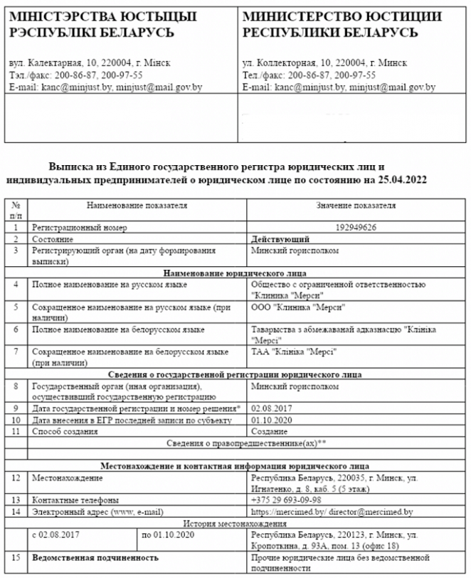 Документ о регистрации «Клиники «Мерси». Фото: Белсат
