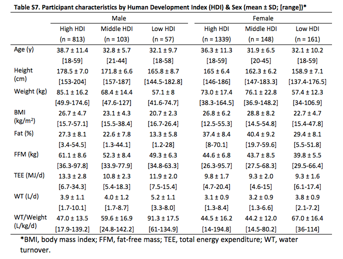 «Люди, которые жили в странах с низким индексом человеческого развития, имели более высокий водный обмен (5,2 литра в день у мужчин и 3,8 литра в день у женщин. — Прим. ред.), чем жители государств с высоким ИЧР (3,9 и 3,1 литра в день соответственно. — Прим. ред). На основе этого обширного набора данных мы предлагаем уравнения для прогнозирования водного обмена у человека в зависимости от антропометрических, экономических и экологических факторов», — рассказали ученые.