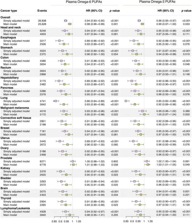 Оценки риска общей заболеваемости раком и 19 раковых участков для 1-SD увеличения плазмы омега-6% и омега-3%, для просто скорректированных и основных моделей. Результаты просто скорректированных моделей показали ассоциации, стратифицированные по возрасту