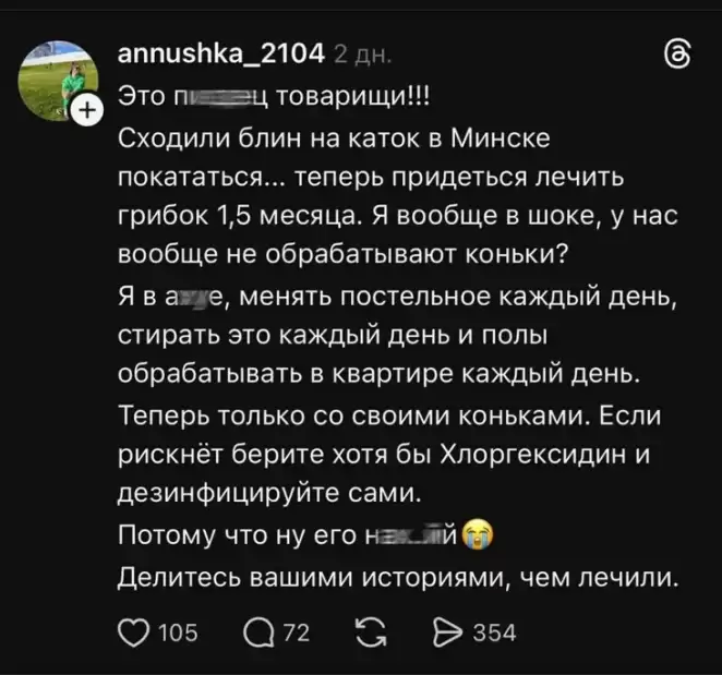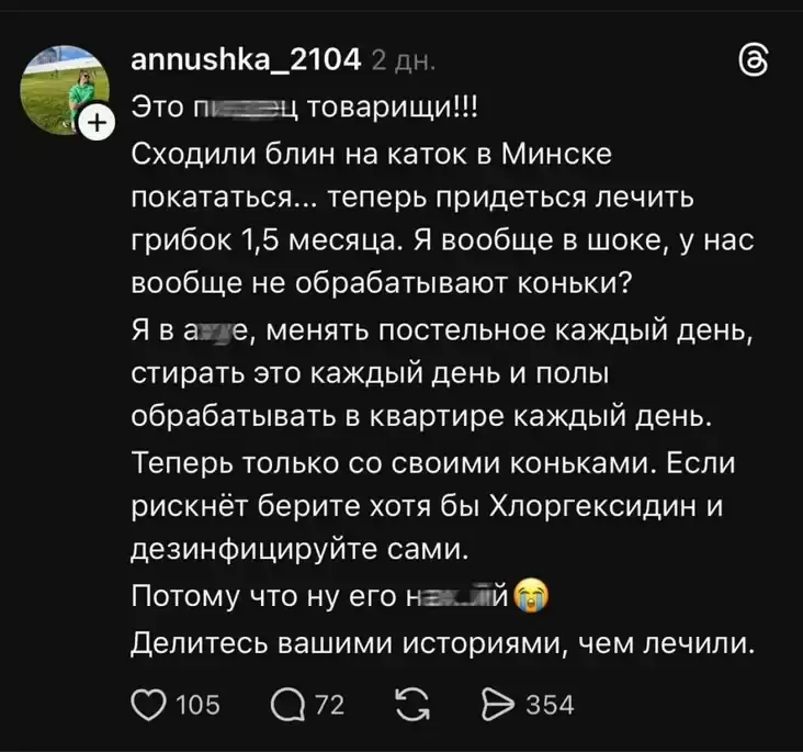 В социальной сети Threads набрала популярность история девушки, которая, посетив каток, заразилась грибком через прокатные коньки. Она выразила возмущение качеством санитарной обработки инвентаря и отметила, что теперь ей придется пройти длительное лечение. После этого случая девушка решила в дальнейшем ходить на лед только со своей собственной экипировкой, пишет «Минская правда».