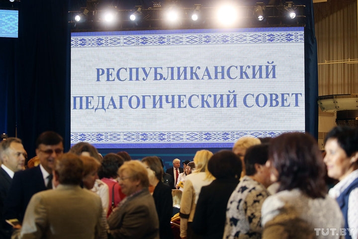 На педсовете в Минске собрались не только учителя, директора школ, преподаватели вузов, но и президент, члены правительства, спикеры двух палат парламента. В зале присутствуют вице-премьер, который курирует образование, Василий Жарко, министр здравоохранения Валерий Малашко, министр образования Игорь Карпенко, бывший министр образования и глава «Белой Руси» Александр Радьков, министр внутренних дел Игорь Шуневич, председатель КГБ Валерий Вакульчик, министр обороны Андрей Равков, депутаты. Всего на педсовете собралось около 800 человек.