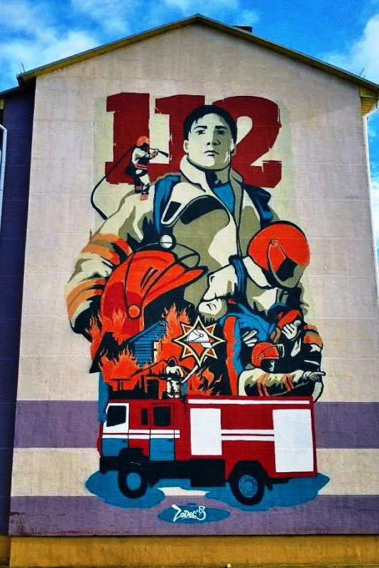 Уточняется также, что «размеры автомобиля(-ей) специального назначения и спасателя(-ей) должны занимать не больше 50% от площади обеих стен жилого дома. На одной из частей стены дома должна быть изображена эмблема МЧС Беларуси и крупным шрифтом (не менее 20% площади стены) – телефон экстренной службы 112.