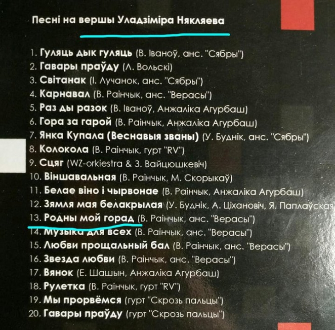 Слова к песне «Родны мой горад» написал Владимир Некляев, музыку — композитор Василий Раинчик. Как видно на скриншоте, в титрах указано, что автором музыки и слов якобы является композитор.