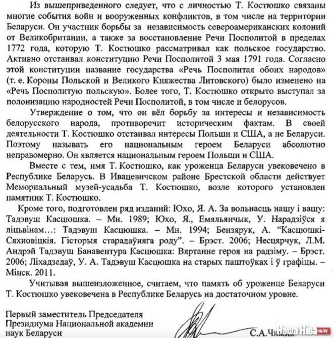 Утверждение о том, что он вел борьбу за интересы и независимость белорусского народа, противоречит историческим фактам. В своей деятельности Тадеуш Костюшко отстаивал интересы Польши и США, а не Беларуси. Поэтому называть его национальным героем Беларуси абсолютно неправомерно. Он является национальным героем Польши и США».
