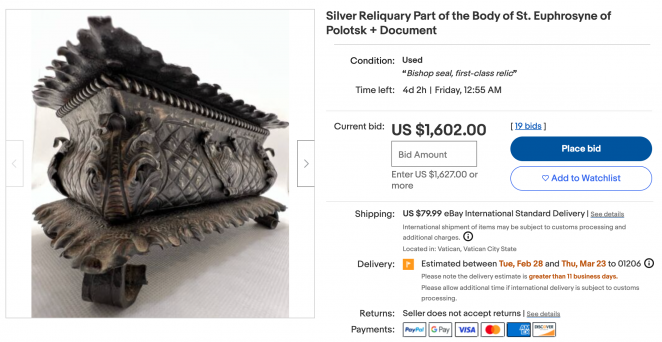 На аукционе Ebay выставлен на продажу серебряный реликварий с частью тела, как утверждается, святой Евфросинии Полоцкой. Об этом пишет в своем телеграм-канале Антон Мотолько.