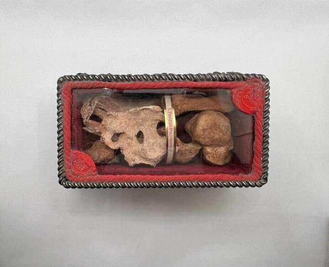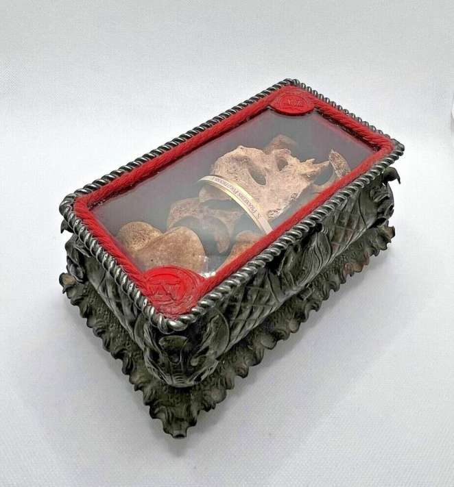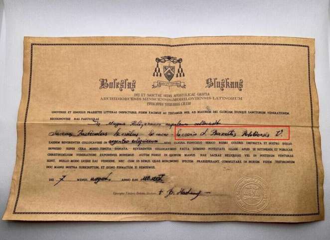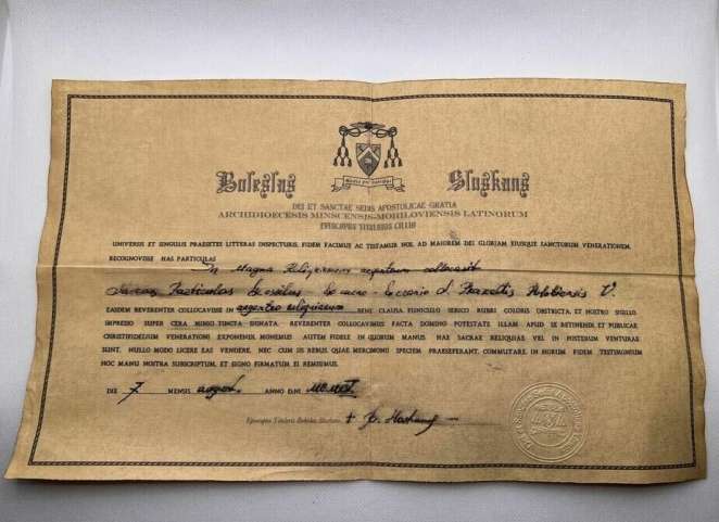 В описании указано, что это мощи из коллекции семьи Слоскансов. Также опубликованы и фотографии документа, который прилагается к мощам. Подписан он католическим епископом Болеславом Слоскансом, там стоит и его печать.