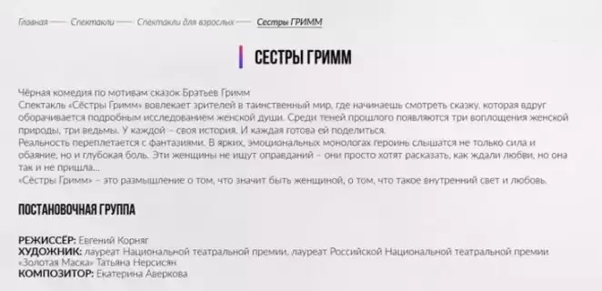 С сайта театра просто удалили страницу о постановке «Сёстры Гримм» (теперь она не открывается). В разделе «Спектакли для взрослых» её нет.