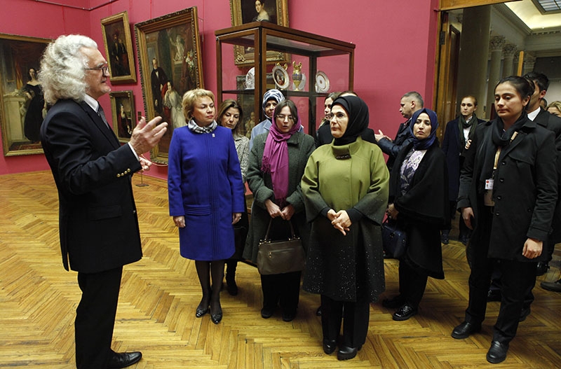 Генеральный директор музея Владимир Прокопцов познакомил госпожу Эрдоган с постоянной экспозицией и временными выставками.