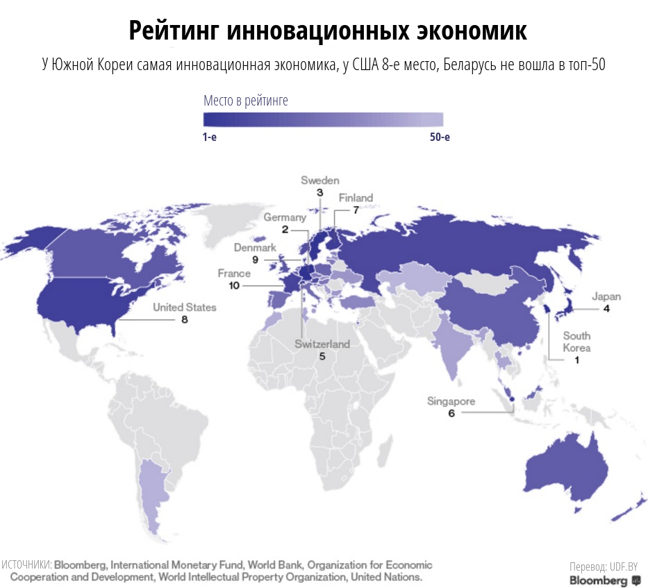 Лидером рейтинга осталась Южная Корея. За ней следует Швеция, обошедшая Германию. Аналитики Bloomberg отмечают, что хотя власти Швеции подняли налоги для бизнеса, жители страны сами по себе очень индивидуалистские и стремятся продвинуться и разбогатеть за счет выдвижения новых идей.