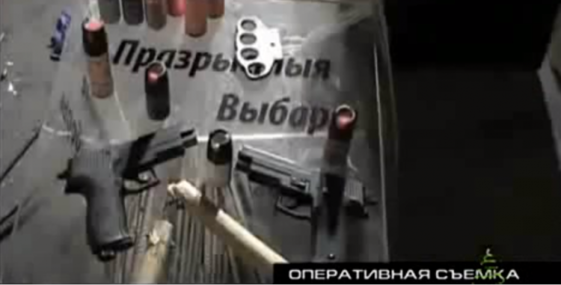 Из того же фильма "Железом по стеклу" мы узнали о минском гараже, в котором хранился арсенал для небольшой банды: патроны, несколько автоматов, взрывчатка и даже гранатомет. След к нему якобы вел от загадочных граждан России, которых задержали на границе с шашками тротила.
