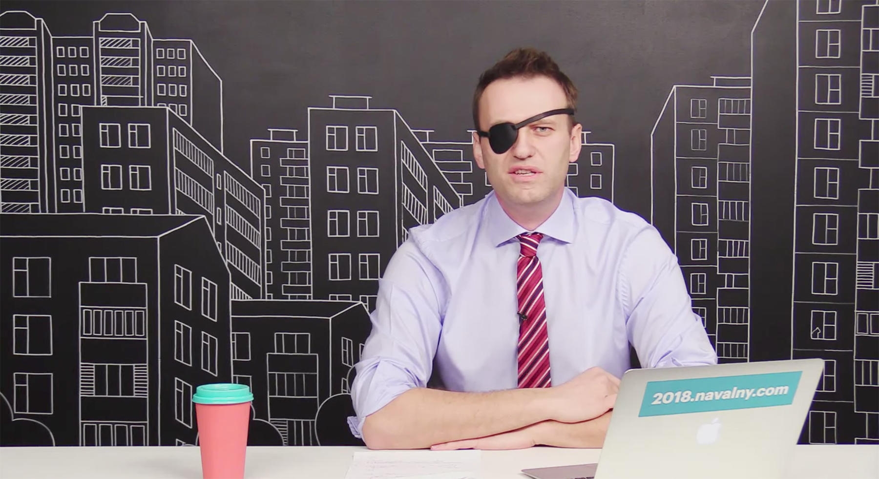 В эфире Навальный появился в повязке, объяснив это тем, что яркий свет вреден для глаза.