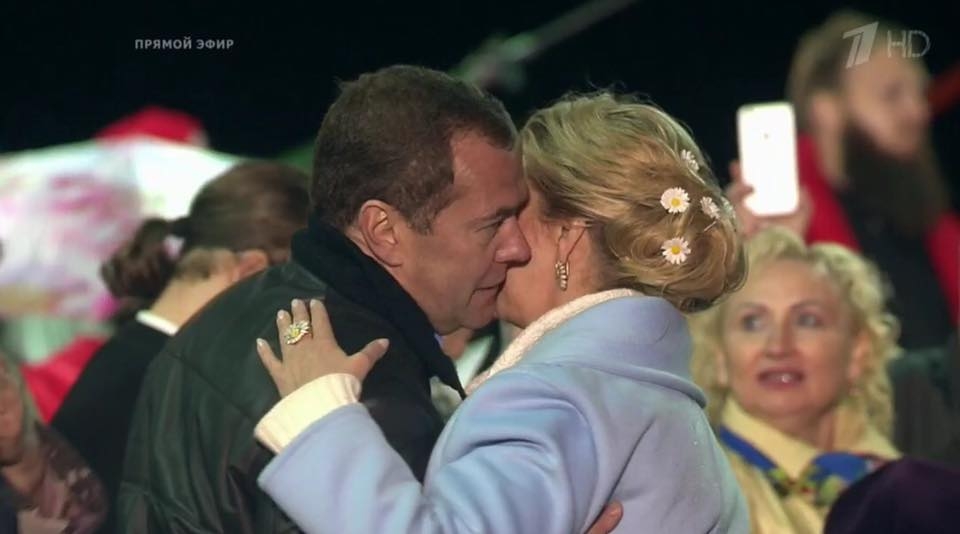 Семья Светланы и Дмитрия на этом концерте трогательно танцевала под бдительным оком охранника и под проливным дождем, который на нее удивительным образом не проливался. С головой Светланы Медведевой по количеству цветочков конкурировал только костюм Филиппа Киркорова.