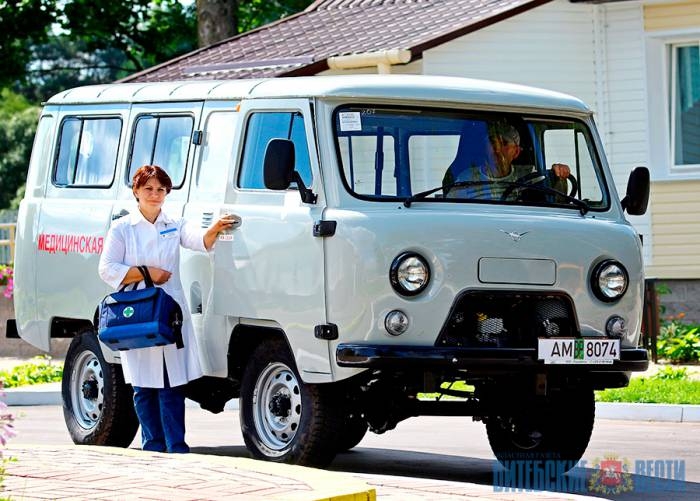 Новенький автомобиль УАЗ 396295-460 – уже прибыл в больницу, в которой, судя по всему, когда-то впервые подал голос Саша Лукашенко.