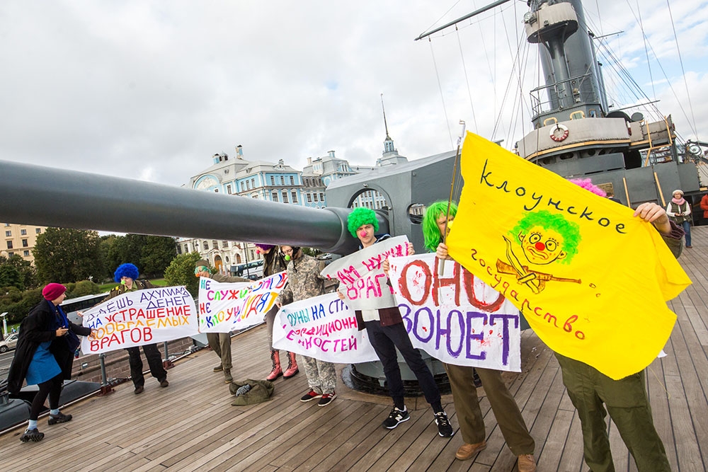 Акция прошла в Петербурге в воскресенье днем. Антивоенные активисты в костюмах клоунов выстроились на палубе крейсера «Аврора». Они требовали роста военного бюджета: «Несправедливо, что у школ, больниц и пенсионеров еще есть какое-то обеспечение, в то время как на эти деньги мы могли бы устроить военные учения, а потом — убивать!».