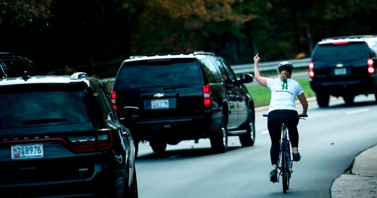 Заокеанская же велосипедистка не просто продолжает спокойно ехать по своим делам, но и, пользуясь случаем, демонстрирует Дональду Трампу своё отношение к нему посредством среднего пальца, поднятого вверх.