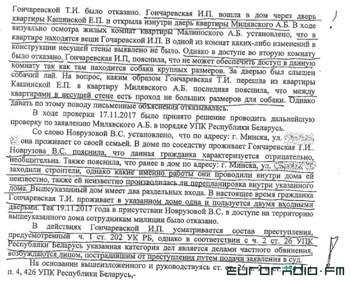 "По документам Агентства по государственной регистрации и земельному кадастру это одноквартирный дом, хотя технически в нём существуют две квартиры, — объясняет Еврорадио Екатерина. — Но там не определён порядок пользования. Мы надеялись, что определим с Милявским порядок пользования или юридически вычленим и оформим две квартиры, и будем жить, как люди. Но, видимо, ему это не интересно, поэтому он подаёт уголовные иски, как будто кто-то куда-то проник без разрешения. Статья 202 Уголовного кодекса — "Незаконное проникновение вопреки воле владельцев". То есть, абсолютно гражданский вопрос об установлении порядка пользования Милявский решает через уголовное преследование".
