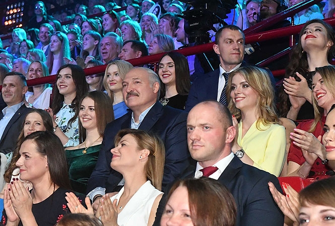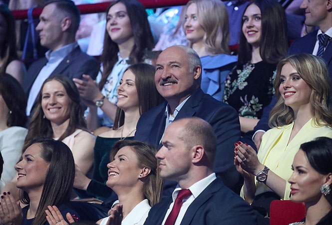 Вот и в нынешнем, 2018-м, Александр Лукашенко не стал изменять своим традициям и удобно устроился в зрительном зале в кампании очаровательных спутниц — блондинки и брюнетки.