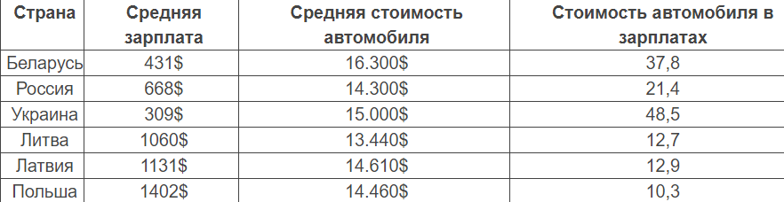 Само собой разумеется, подобное сравнение весьма условно, потому как средняя зарплата по стране, к тому же до уплаты всех налогов, понятие весьма абстрактное. Впрочем, как и "средневзвешенный" ценник на автомобиль.