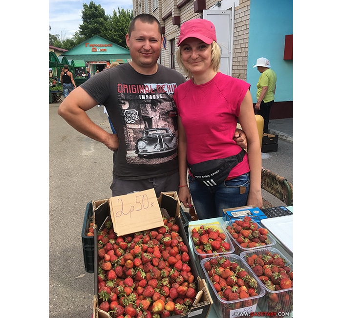 Семейная пара Ирина и Андрей продают клубнику на слуцком рынке.