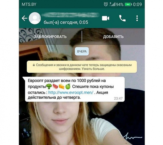 - От имени «Евроопта» действуют мошенники! - заявили представители «Евроопта». - В последнее время в WhatsApp пользователи получают сообщения якобы от имени «Евроопта» с предложением ответить на ряд вопросов и ввести номер банковской карты для получения денежного вознаграждения. Мы убедительно просим всех наших покупателей игнорировать подобного рода сообщения и не поддаваться на провокацию! Информация обо всех акциях магазинов «Евроопт» публикуется только на официальном сайте evroopt.by. Пожалуйста, не передавайте неизвестным сведения о своих банковских карточках. Будьте бдительны!