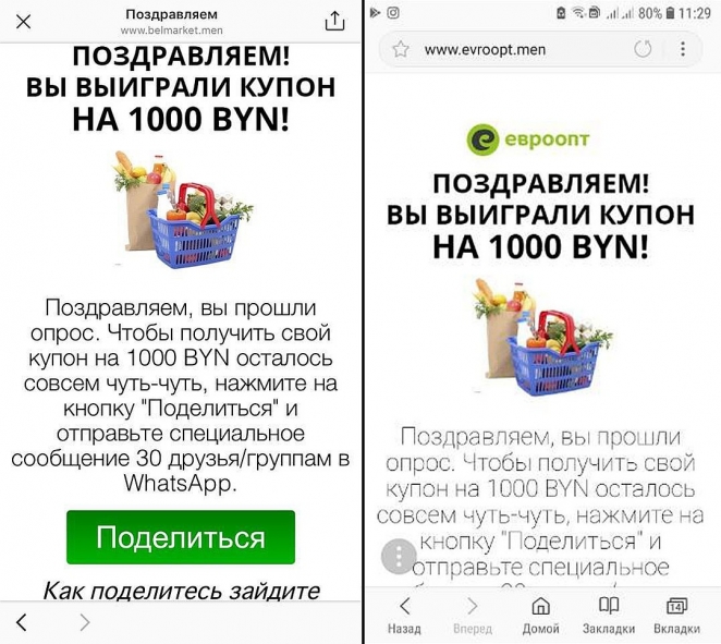 Мошенники под видом «Евроопта» и «Белмаркета» рассылают сообщения о крупном выигрыше. Фото: скриншот / соцсети Евроопта и Белмаркета