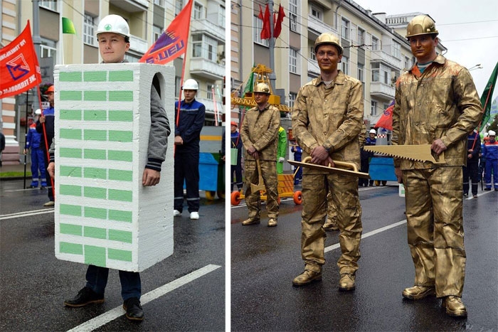 Вот вам гомельские Человек-кирпич (или почтовый ящик многоэтажки или МАПИДовский дом-урод), золотые строители и полицай с машингевером, который едет устанавливать новый дорожный знак.