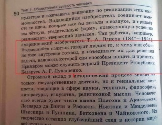 В 2015 году белорусы обратили внимание на учебник «Обществоведение» за 9 класс. Его авторы, кажется, не сомневаются в гениальности руководителя страны. В разделе «Роль личности в истории» Лукашенко привели в качестве примера выдающегося политика и фактически поставили в один ряд с Платоном и Аристотелем.