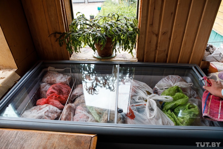 Когда в 2013 году в Беларуси вспыхнула АЧС, люди массово кололи свиней и скупали морозильные камеры. Как напоминание о тех событиях в доме Людмилы и Николая стоит большой холодильник, в таком обычно в супермаркетах хранится мороженое. По словам пары, в него спокойно «залазит два кабана». Для большой семьи размер — главный критерий.