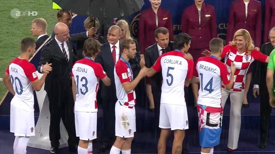 А над французом и хорваткой ни хрена. Их заливает по полной. Ну, потому что живые, что им сделается. И немецкий комментатор с изумлением говорит: как же так — над российским президентом зонтик раскрыли, а над Францией и Хорватией — нет.