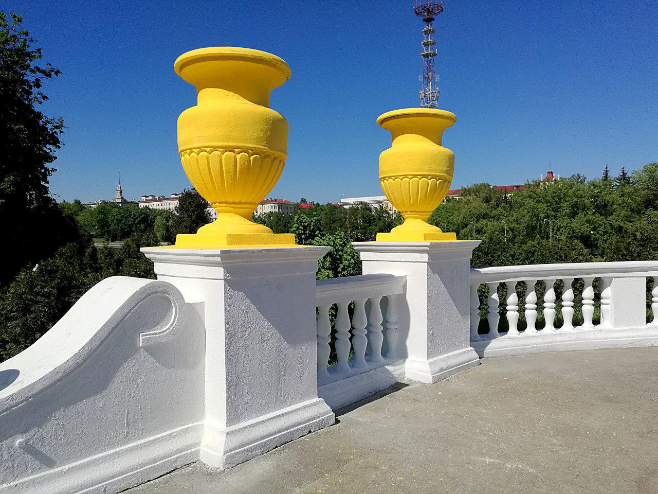 А на проспекте Независимости зачем-то покрасили желтым вазы. Рекламный ход velcom?