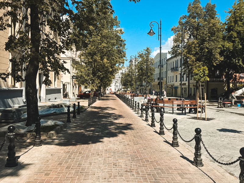 Между большинством столбиков еще и натянули цепи. Наверное, чтобы предотвратить пьянство на новой пешеходной улице: теперь все алконавты просто поубиваются головой о тротуарную плитку, цепляясь за цепи ногами.
