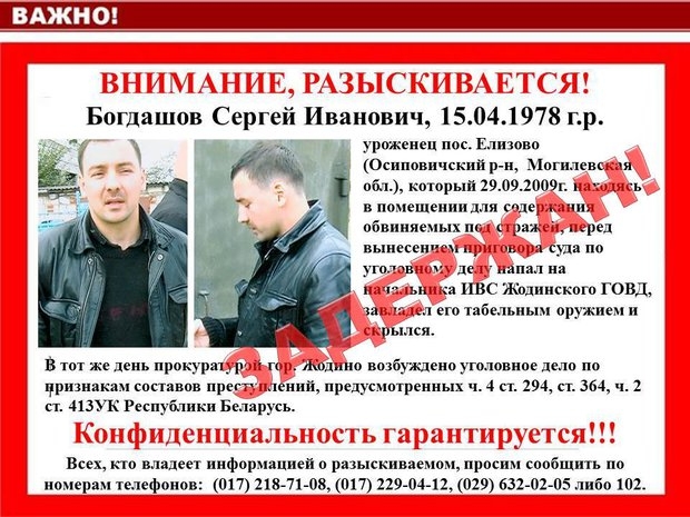 29 мая 2009г. ранее судимый Сергей Богдашов, 1978 г.р., уроженец поселка Елизово Могилевской области, должен был выслушать свой очередной приговор за три десятка краж. Суд удалился в совещательную комнату, а обвиняемый под конвоем отправился в ИВС. Как установлено следствием, в 14.40 он напал на начальника ИВС Жодинского ГОВД, завладел его табельным оружием - пистолетом Макарова с 16 патронами - и скрылся. Как позже стало известно, он угнал в Смолевичском районе автомобиль и уехал на нем в Россию, где еще дел натворил уголовных.