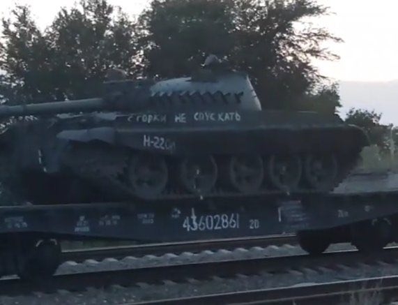 На перевозимых эшелонами танках есть характерная для находящихся на консервации машин надпись «с горки не спускать». К слову, танки с подобной надписью были замечены в Сирии.