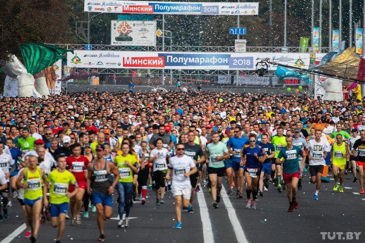 9 сентября в 9 утра 35 тысяч человек бежали полумарафон в центре Минска. Говорят, это белорусы тренировались бежать из страны после запуска БелАЭС. Призовой фонд для победителей составил 50 тысяч долларов. Но лучшее поздравление досталось на финише бегуну с бело-красно-белым флагом по имени Уладзь, которого поздравил ОМОН и, усадив в автозак, повез в РУВД составлять праздничные протоколы.
