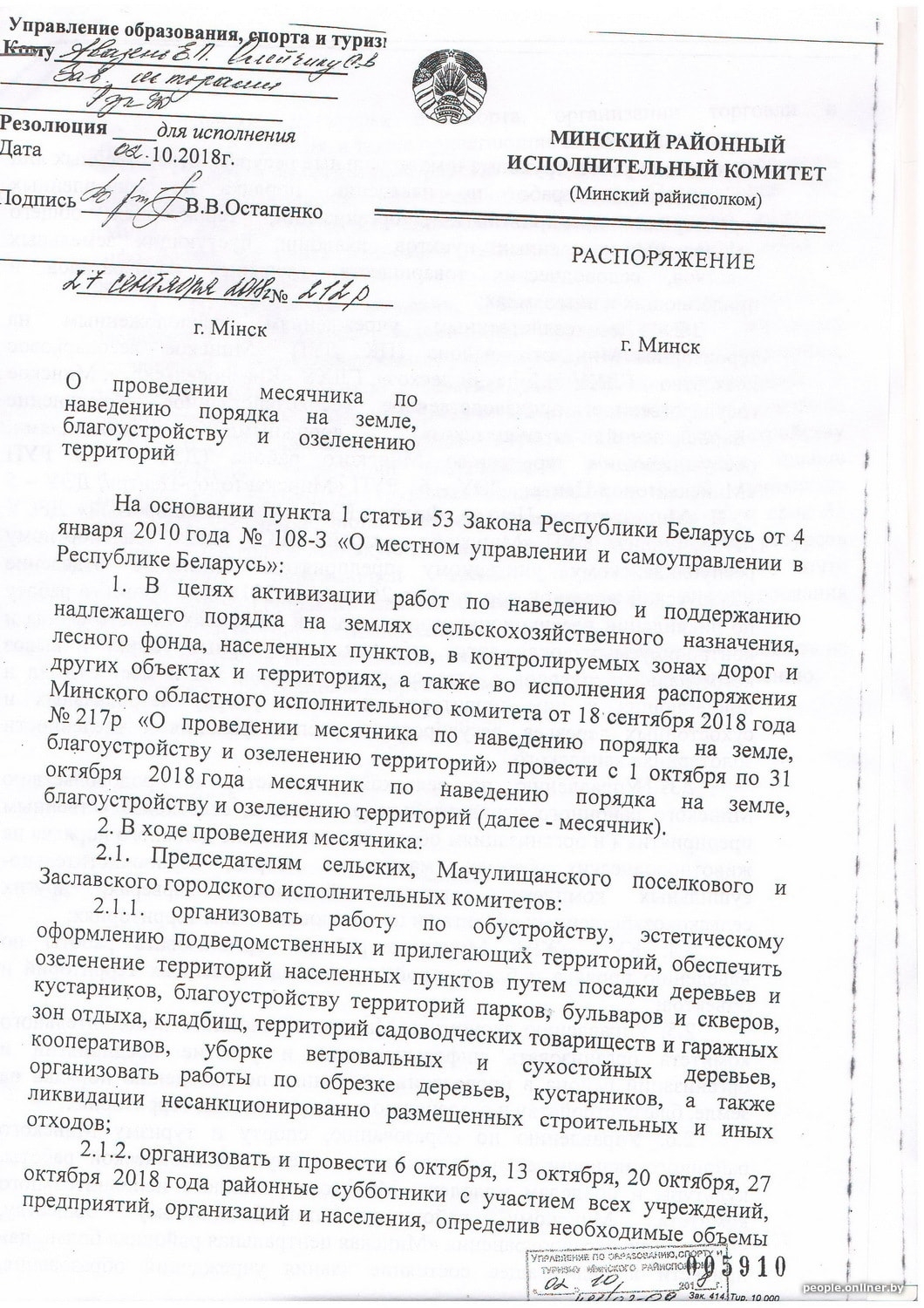 «Руководители учреждений образования должны организовать и провести 6 октября, 13 октября, 20 октября, 27 октября 2018 года субботники. Отчеты о проделанной на субботниках работе направляются в управление по образованию, спорту и туризму Минского райисполкома по электронной почте не позднее 8 октября, 15 октября, 22 октября, 29 октября 2018 года соответственно».